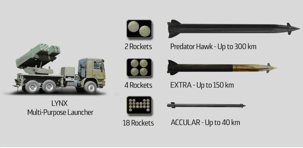7 – 370 მმ Predator Hawk – უახლესი მოდელის კორეაქტირებადი მაღალი სიზუსტის რაკეტა. კლასიფიკაციით პოზიციონირებს საარტილერიო რეაქტიულ რაკეტასა და ტაქტიკურ რაკეტას შორის.