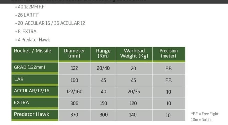 4 – 160 მმ AccuLar 160 – GPS დამიზნების მაღალი სიზუსტის რაკეტა. შექმნილია Lar-160 MK-4 რაკეტის ბაზაზე. სროლის მანძილი 45 კმ. 2X10 რაკეტიანი ერთჯერადი პაკეტი. რაკეტის მასა 100 კგ. ქობინის მასა 35 კგ.