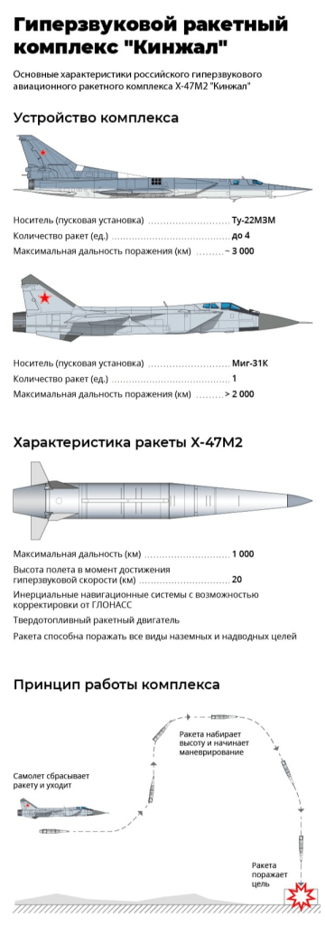 კონკრეტულად აერობალისტიკური რაკეტა Кинжал ტექნოლოგიურად სხვა არაფერია თუ არა კარგად ცნობილი ბალისტიკური სარაკეტო კომპლექსი Искандер-ის 9M723 ტიპის რაკეტის საავიაციო ვარიანტი, ოდნავ განსხვავებული გეომეტრიული კონფიგურაციით, მაღალი სიჩქარით და ფრენის ორჯერ მეტი მანძილით.