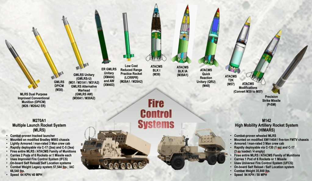 – MGM-140 ATACMS – ტაქტიკური რაკეტა, სხვადასხვა მოდიფიკაციებში 300 კმ-მდე სროლის მანძილით.