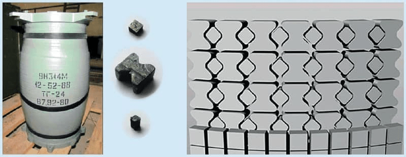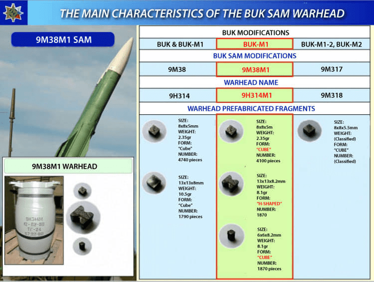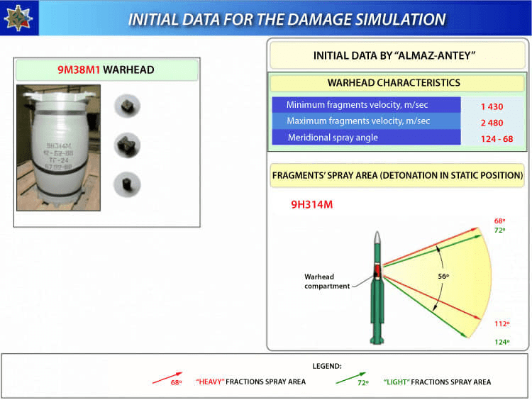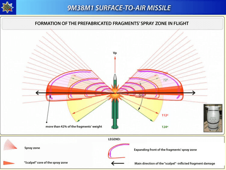 Бук-М1 ტიპის საზენიტო-სარაკეტო კომპლექსის საზენიტო რაკეტა 9M38M ის მსხვრევად-ფუგასური მუხტი 9Н314М, მისი მზა დამაზიანებელი ელემენტები და აფეთქებისას წარმოქმნილი დაზიანების ზონები.