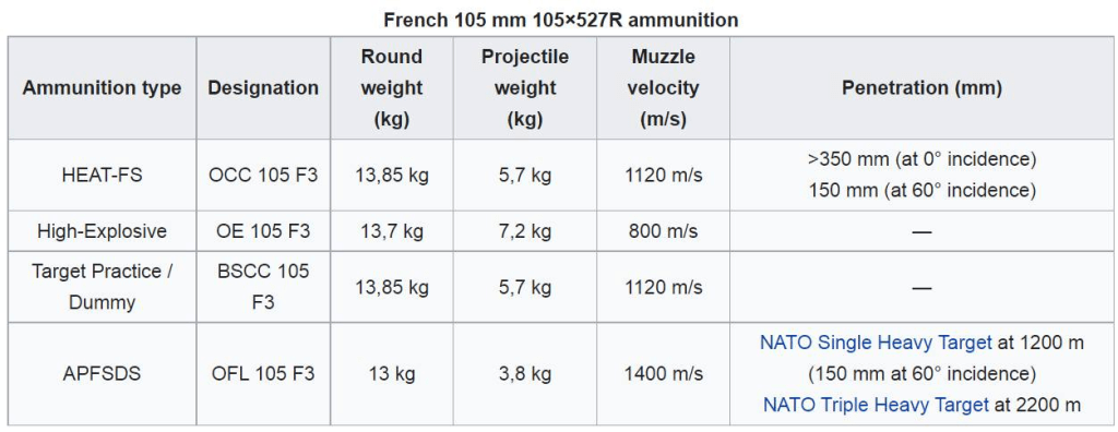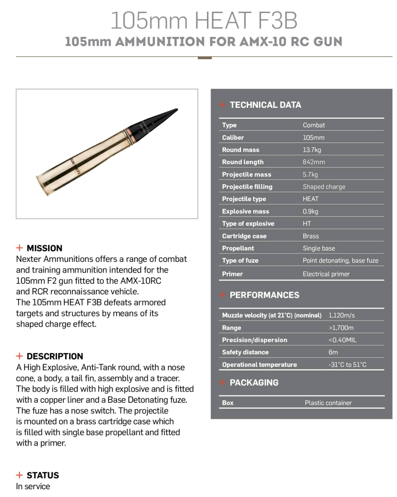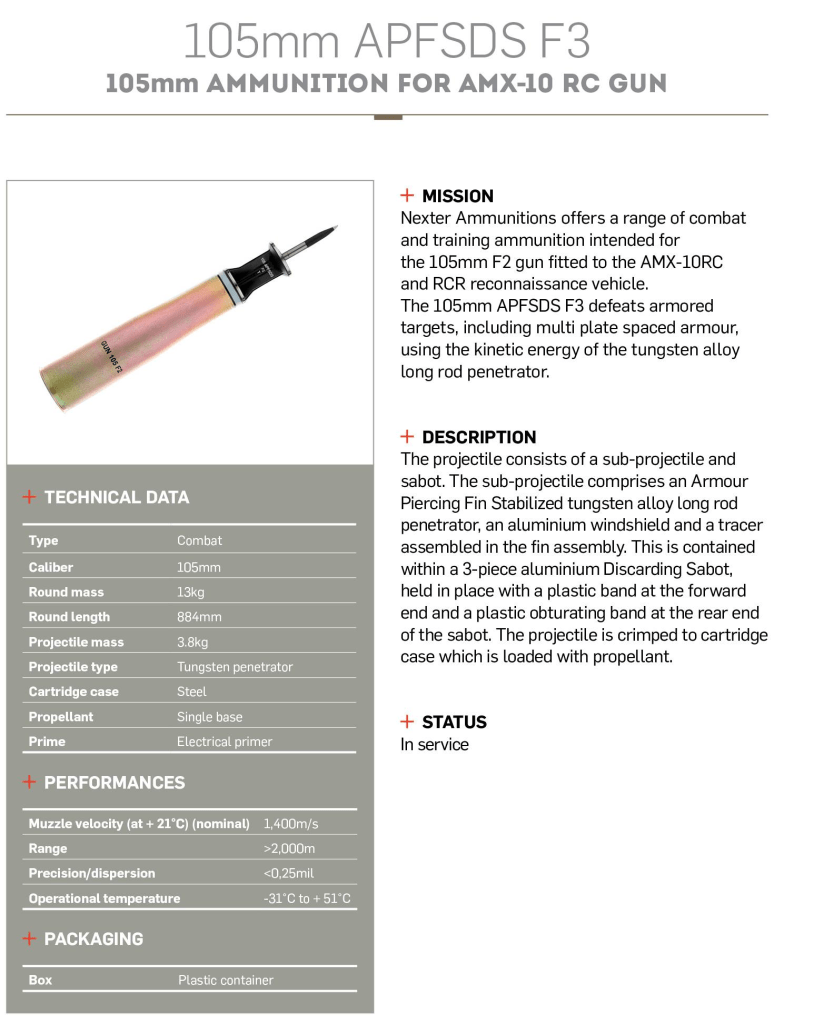 ქვეკალიბრული OFL 105 F3, 3,8 კგ ჯავშანგამტანი ისრით – NATO Single Heavy Target – 150 მმ გამტანობა 1200 მეტრზე 60° მოხვედრისას.