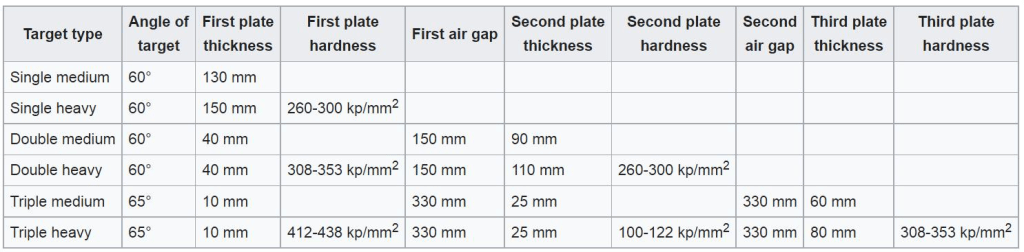 კუმულაციური ჭურვი OCC 105 F3, 5,7 კგ. – 90° მოხვედრისას 350 მმ. 60° მოხვედრისას 150 მმ.