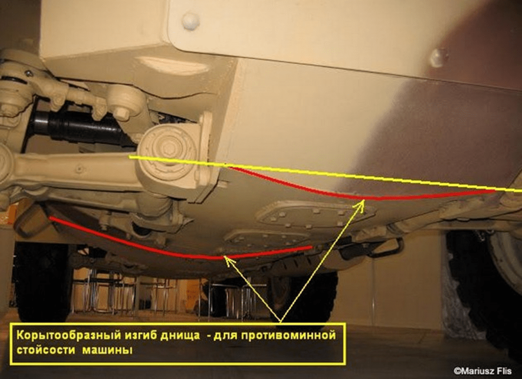 მანქანის ფსკერის ნაღმსაწინააღმდეგო დაცულობას ცილინდრული ფორმა განაპირობებს, რამაც თეორიაში აფეთქების ენერგია უნდა გაფანტოს. კორპუსის შიგნით გამოკრულია კევლარის ნამსხვრევსაწინააღმდეგო სარჩული.
