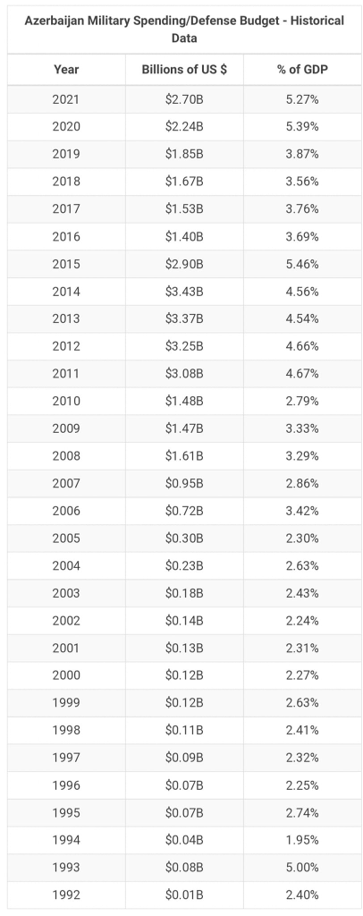 ილჰამ ალიევის გაპრეზიდენტების შემდეგ აზერბაიჯანის სამხედრო ხარჯების მოცულობა 2004 წლიდან დღემდე მთლიანობაში 50 მილიარდ დოლარამდეა.