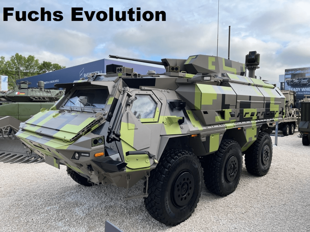 11) Fuchs Evolution. ბორბლებიანი ახალი ტიპის საჯარისო სადაზვერვო მანქანა კომპანია Rheinmetall-ისგან. აგებულია ჯტრ Fuchs-ის ბაზაზე. შეიარაღება 25 მმ ავტომატური ქვემეხი Rheinmetall KBA 25×137.