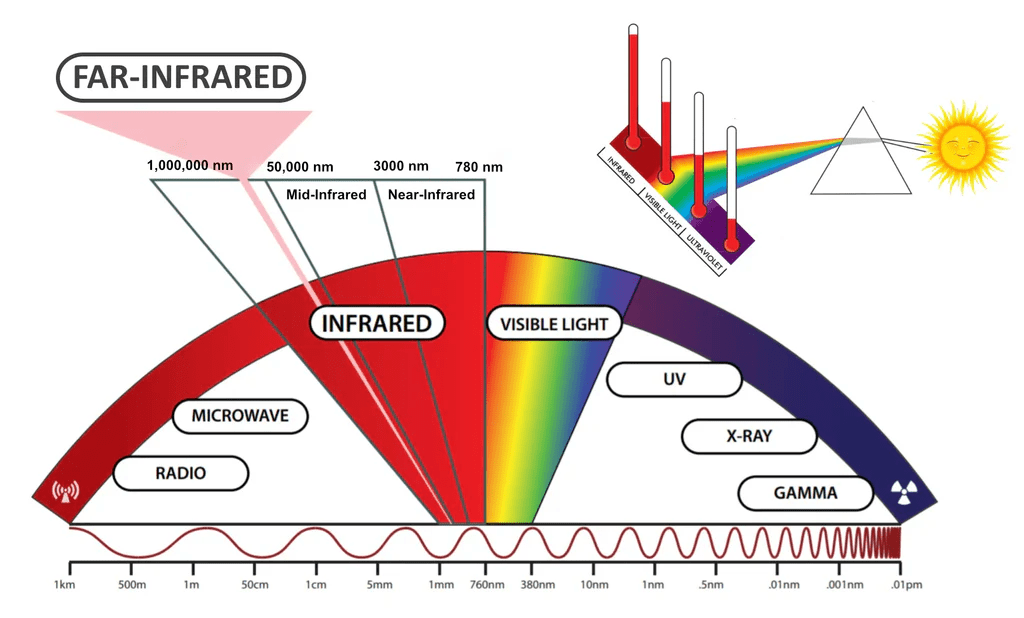 | შორეული ინფრაწითელი (FIR) | 15 – 1000 μm | შედარებით დაბალი ენერგიის მქონე. გამოიყენება სამეცნიერო კვლევებში, ასტრონომიაში, ბიოლოგიაში და სამედიცინო თერაპიაში. |